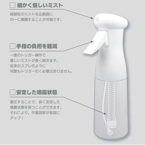 超微粒ミストが出るスプレー。1回のレバー操作で約3秒間、5回で約10秒間連続で霧が出ます。スタイリングや水やり、掃除など、様々な用途にお使いいただけます。※連続噴霧時間は使用する液体により異なります |