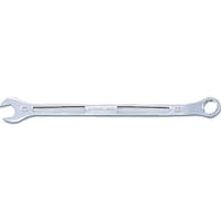 鍛造品で強いです。JIS規格品に比べ長く、スパナ部・めがね部ともに同じ厚さです。めがね柄部の曲がり角度15°です。狭い所でのダブルナットの締め付けなど。 |
