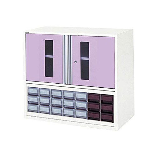 扉は収納式で作業時に邪魔になりません。上部収納庫は可動棚が付属しており、50mm間隔で調節できます。アンプルを保管できます。ケースの抜け落ち防止ストッパーが付いています。扉は鍵付き収納式です。 |