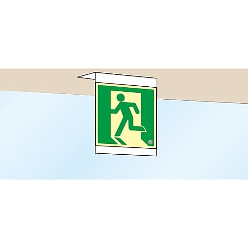 壁面貼付け場所がない箇所の天井に!プレートには段差が付いています。小さい標識は水平の目安になります。 |