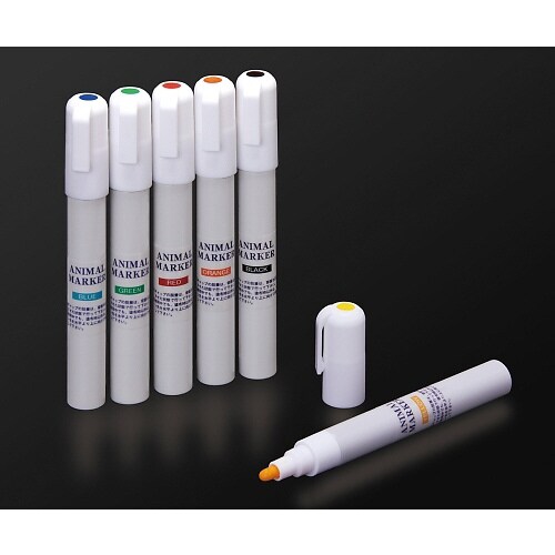 「法定色素」を使用した、安全性に優れた実験動物用マーカーです。塗布後、一旦乾くと動物が舐めても色落ちしません。動物の被毛に染み込ませた場合は、通常6から12週間程度は良好な識別力を保ちます。 |