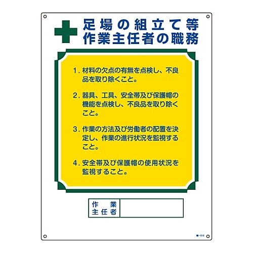日本緑十字社 作業主任者の職務標識 「足場の組立て等 作業主任者の職務」 職−515 049515 標識・安全テープ類 安全標識 1枚 4527-5548