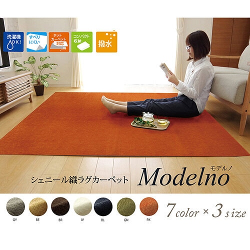遊び毛が出にいシェニール糸を使用したラグです。毛足が短いためお掃除も簡単です。裏面にはフローリングの上でもご使用できるよう、滑りにくい加工を施しております。洗濯機で丸洗いでき、お手入れが簡単です。 |