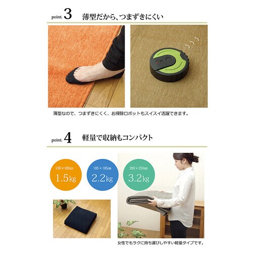 遊び毛が出にいシェニール糸を使用したラグです。毛足が短いためお掃除も簡単です。裏面にはフローリングの上でもご使用できるよう、滑りにくい加工を施しております。洗濯機で丸洗いでき、お手入れが簡単です。 |
