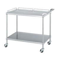 組立式。耐食性に優れたSUS304製ワゴン。二段式(ガード付棚一段)。片側ハンドル。下棚位置変更可(25mmピッチ)