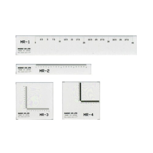 対物マイクロメーターのように、顕微鏡観察下で対象物を測定できる微小目盛です。ものさしの形状をしたタイプと、カバーグラスのように対象物にかぶせて使用するタイプのセットです。 |