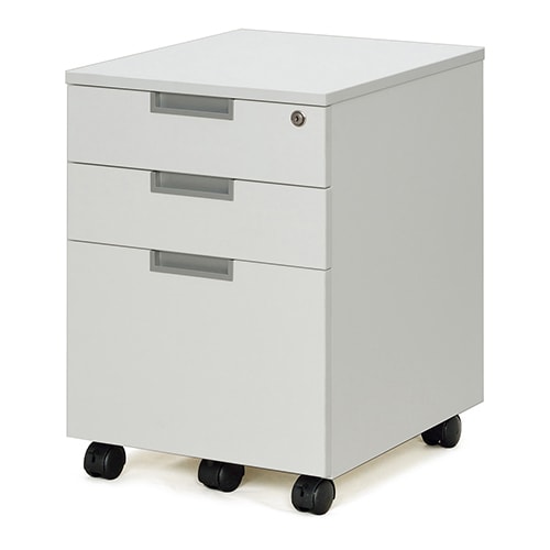 RFSLDスチール脚デスクのサイズに合わせた奥行き490mmの三段ワゴン。ペントレーが付き。下段のみフルオープン、上中段は1/3ほど残して引き出せなくなる仕様です。 |