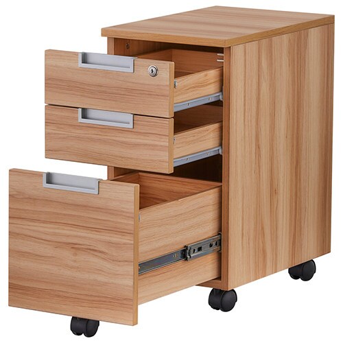 アソートシリーズのスチール脚デスク用に設計された奥行き490mmの3段スリムワゴン。幅1000mmのデスク下に置いてもちょうど良いサイズ感で足元が窮屈になりません。 |