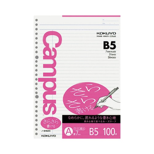 ルーズリーフ B5A罫マージン罫入26穴100枚 A罫 1冊 ノ−846AN バインダー用ノート