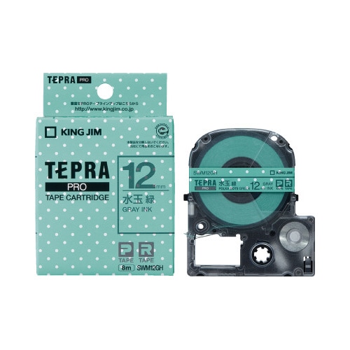 SWM12GH「テプラ」PROテープカートリッジ TEPRA模様ラベル 水玉緑・グレー文字12mm幅8m巻 SWM12GH テプラ(キングジム)用 ラベルテープ/シール 1個
