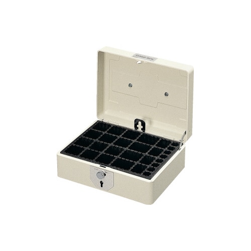 スチールで丈夫!鍵付きの印箱。出し入れがしやすくなる傾斜装置がついています。取っ手がつまみやすいデザインを採用。 |
