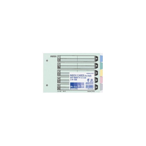2穴タイプのカラー仕切カードはこちらがオススメ。5山見出しがセットになっているから、書類の分類・検索の効率アップに最適です。 |