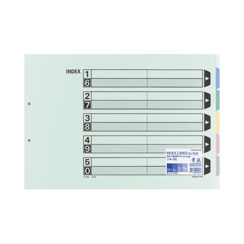 2穴タイプのカラー仕切カードはこちらがオススメ。5山見出しがセットになっているから、書類の分類・検索の効率アップに最適です。 |