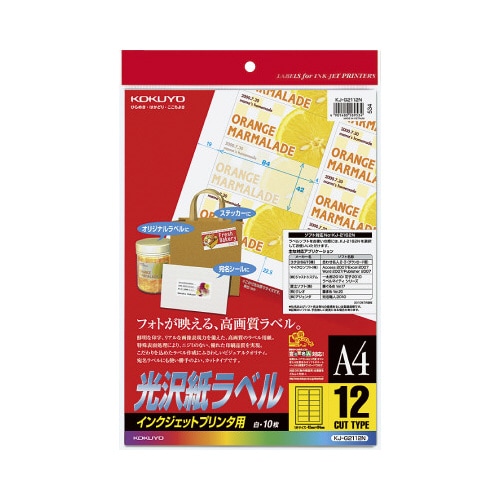 インクジェット用光沢紙ラベル A4 12面 光沢紙 1冊(10枚入) KJ−G2112N ラベルシール ラベル用紙(スタンダードタイプ)