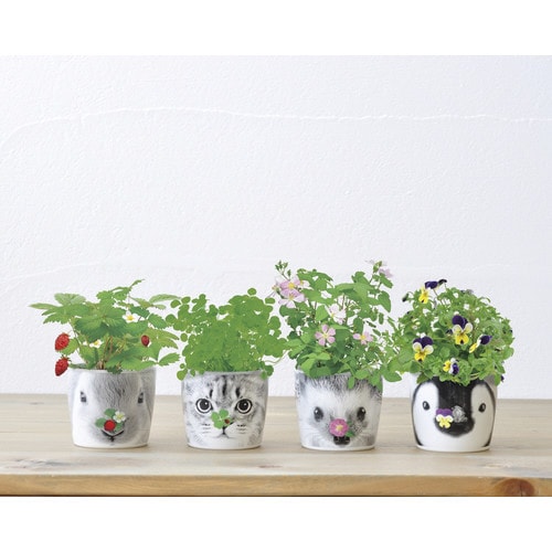 動物たちのおはなにちょこんとのった植物を育てます。陶器製のポットは総柄で、バックスタイルも愛らしい仕上がりに。あなたを見つめる動物たちのつぶらな瞳に癒されながら植物を育てて、お世話を楽しんで。 |
