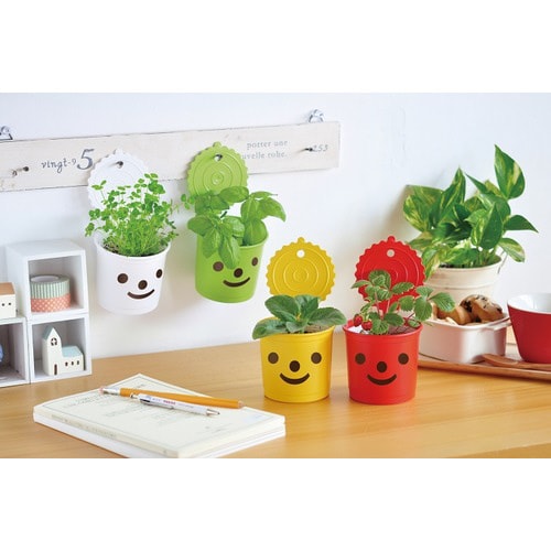 見た人をハッピーにしちゃうスマイルポットで育てる栽培セット。蓋には穴が開いているので壁に飾って楽しむこともできます。栽培が終わったら小物入れにしてもかわいい!