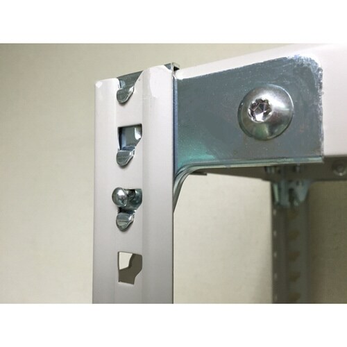 最小限のボルトで組み立てが可能です。上下段のみにボルトを使用するため、従来のアングル棚に比べて組み立てや中間棚の段替えが簡単です。従来の金属製ベースに比べて床を傷つけることなく設置できます。 |