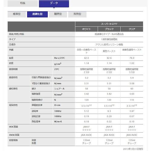 速硬化タイプで低温硬化性良好です。幅広い素材に接着できる多用途タイプです。高い耐久性があります。日本接着剤工業会 JAIA F☆☆☆☆規格品、4VOC基準適合品です。シロキサンフリーの環境対応品です。 |