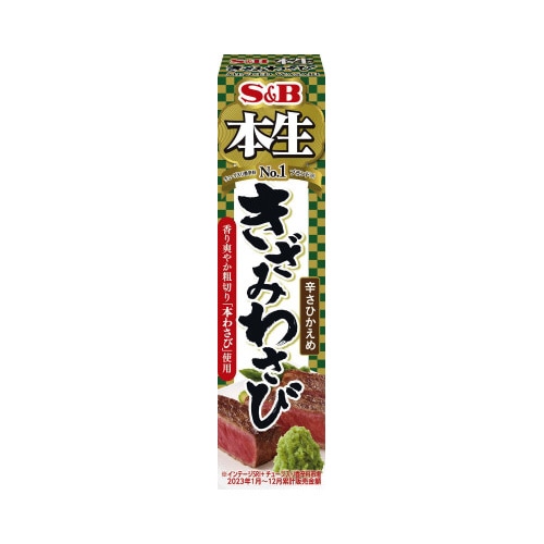 S&B本生は、素材本来のおいしさや香りを追求したねりスパイスシリーズです。使用するわさびは100%本わさびです。粗めにきざんだ茎のシャキシャキ食感と、わさび本来の爽やかな香りが特徴です。辛さ控えめ。 |