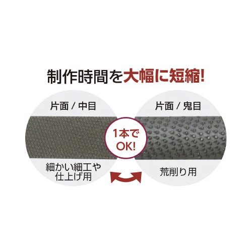 1本で荒削りから仕上げまで! 両面がちがう機能的なやすり!平らな面は中目、半丸面は鬼目になっています。 |