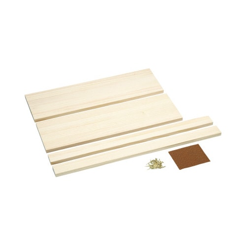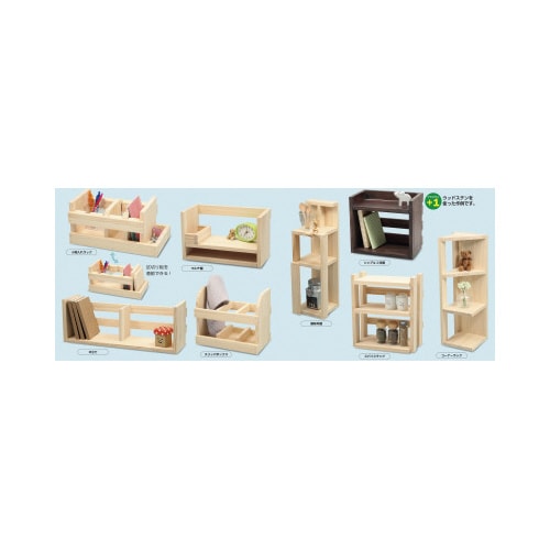 省スペースを意識したお手軽木工セット。8種類の作例図面で実用性の高い作品がつくれる。横はぎのみで加工しやすいラジアタパイン集成材使用 |