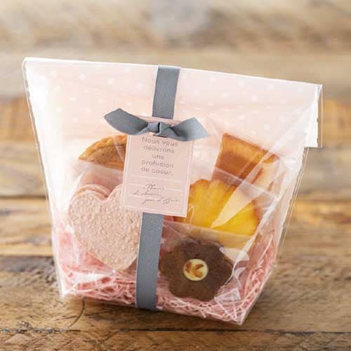 OPP袋を折ってリボンを固結びするだけでキュートなラッピングが完成。OPP袋には折り曲げ位置の印入り、誰でも簡単にラッピングを仕上げられます。組み合わせに悩んだり半端に資材を余らせることもありません。 |