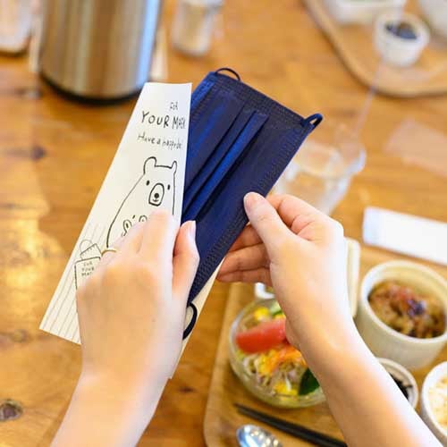一時的なマスクの保管に便利な紙製マスクケースです。飲食店や歯科医院、子ども会行事や学校など様々なシーンでお使いいただけるベアのかわいいデザイン入りの紙製マスクケースです。 |