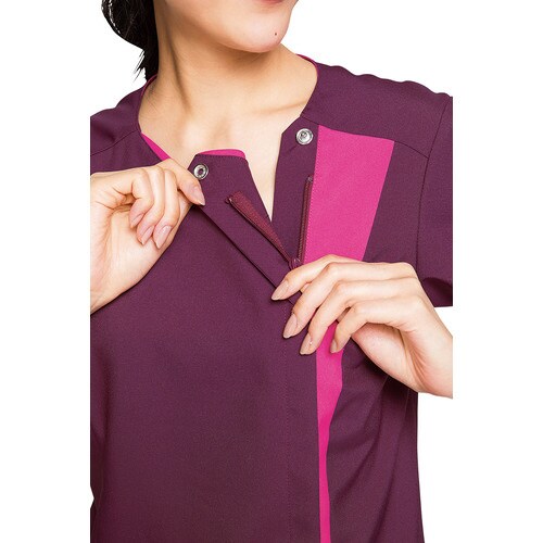 左前のラインがオシャレな女性用ジップスクラブ。グッドデザイン賞受賞のジップスクラブは、羽織って着られる前ファスナー仕様で、着脱時に髪が乱れたりメイクが崩れる心配もなく安心で快適です。 |