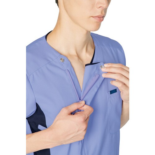 両脇の切り替えカラーが全体を引き締めた印象にしてくれるスマートなメンズジップスクラブ。ジップ部分は男前立(右前)の合わせ。シャツやジャケットと同じ感覚で着られます。 |