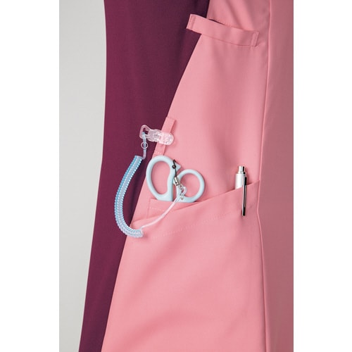 背中・脇ニットのレディースジップスクラブ。動かすことが多い背中と脇部分にストレッチ性の高いニット素材を施すことで動きやすく、アクティブな職種の方にオススメです。 |