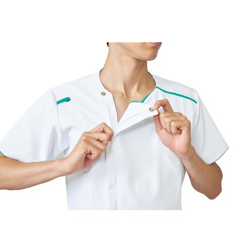 ストレッチ素材で動きやすい、白衣とスクラブのハイブリットである男性用ホワイトジップスクラブ。羽織って着るジップタイプなので、着脱時が楽チンで快適です。 |