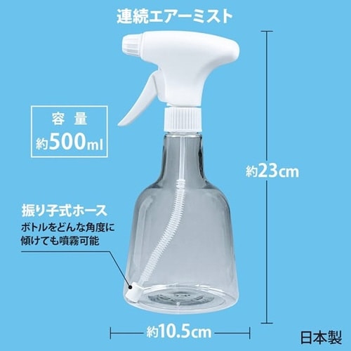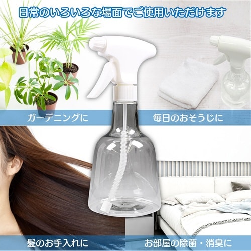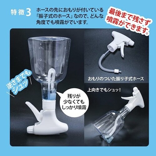 通常のスプレーよりも細かくムラのない霧を出すことができます。ミストが止まる前にレバーを繰り返し引いてください。楽に連続してミストが出続けます。どんな角度でも噴霧可能です。 |