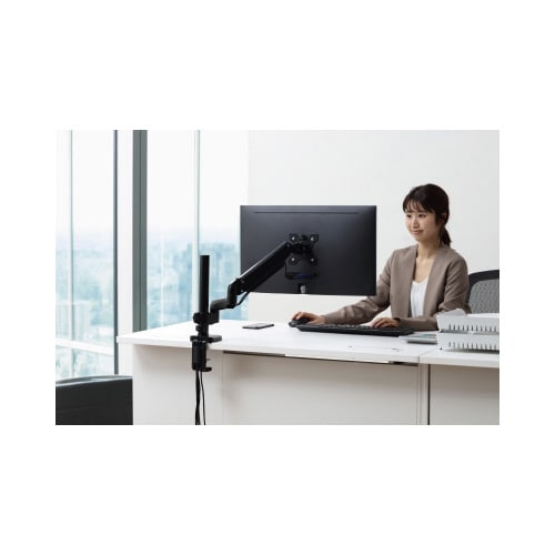 デスクに取り付けて自由な角度や向きに調整できる、ディスプレイアームです。VESA規格に対応しているので、様々なサイズのディスプレイに取り付けできます。 |