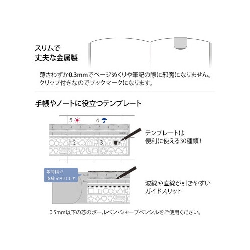 手帳やノートにクリップできる、テンプレート付き薄型定規です。ページに挟んでインデックスがわりにできるほか、テンプレートが30種類ついているのでマークをいつでもきれいに描けます。 |
