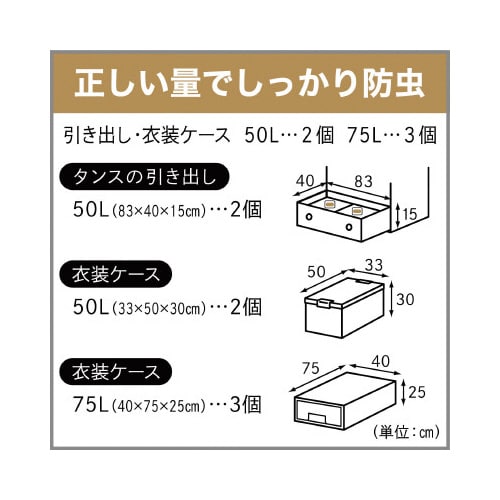 防虫効果が1年持続。長期間、同じ場所で収納している衣類に最適で、ニオイがつきません。防カビ剤配合。 |