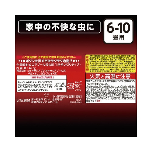 お部屋に発生・侵入する幅広い種類の不快害虫を駆除。ボタンを押すだけの簡単スタートで1−2時間の短時間で完了します。火災警報器にカバー不要の「霧タイプ」なのでマンションやアパートでの使用に適しています。 |