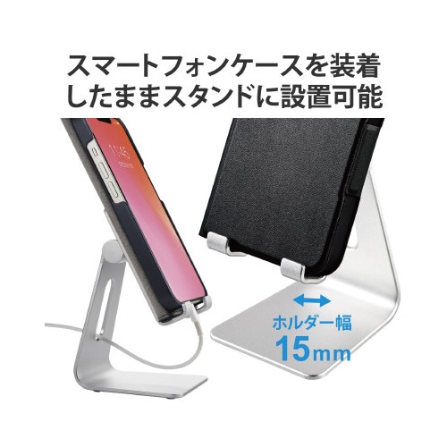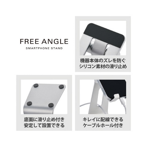 スマホスタンド 卓上 アルミ素材 角度調節可 ケーブルホール付 4.6〜6.9インチ対応 デスク シルバー