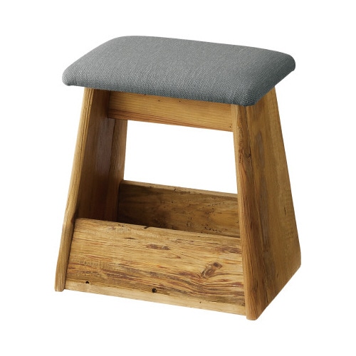 収納できるスツール。ひとつひとつ表情の異なるパイン古材の質感とファブリックの組み合わせが上質な空間を演出します。座面下は収納スペースになっているので雑誌などを収納することもできます。 |