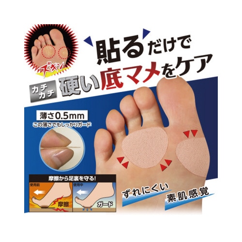 クッションや厚みのあるテープでは痛かった底マメを0.5mmの薄さでカバーして、底マメの痛みを軽減します。足裏の筋肉の動きにそってテープが伸びるので底マメに密着し、薄いのでつけ心地も快適です。 |