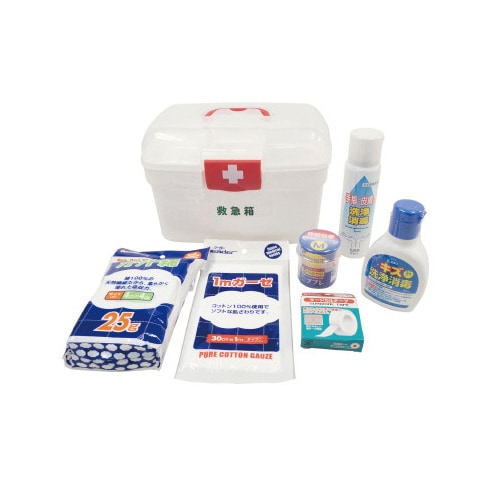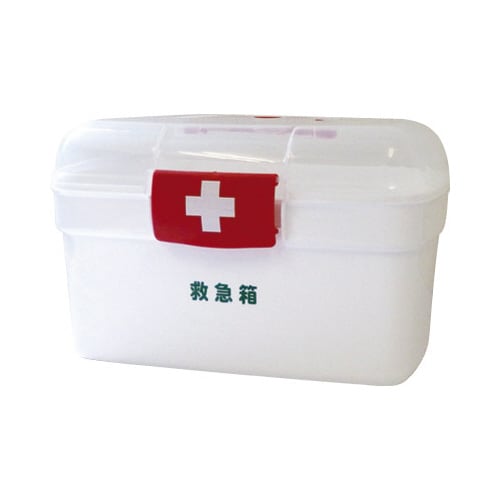 ご家庭の常備薬や衛生用品の管理に最適なプラスチック製の救急箱です。仕切りのあるトレー付なので、小さなものも整理収納できます。すぐに使える衛生材料セット付 |