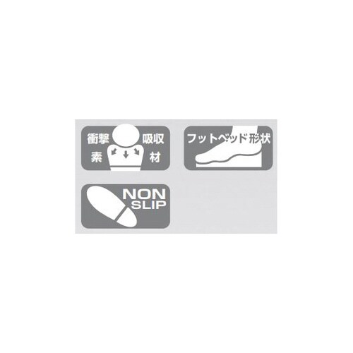耐久性、弾力性に優れ、すべりにくく、疲れを感じさせません。足裏は衝撃吸収材の入ったフットベッド形状を採用。3Eの幅広タイプは、底に軽量ゴムを使用しています。 |