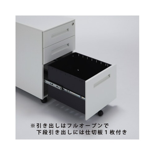 低価格でお買い得のスチールデスクワゴン。カギ付き、全段フルオープン引出で下段引出はA4ファイルが収納できます。