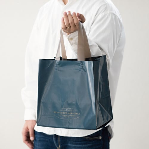 通年使えるベーシックなデザインの持ち帰り袋です。シックなブルーグリーンカラーで男性も持ちやすくてお勧めです。リサイクル原料を30%含んでいるので中身が透けにくいのも特徴です。 |