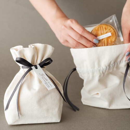 無地の布製巾着袋です。ナチュラルな素材感にあしらったチャコールグレーのグログランリボンが雰囲気を引き締めます。焼菓子や小物のラッピングにはもちろん、お持ち帰り用の袋にもお使いいただけます。 |