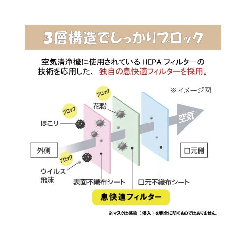 花粉・ウイルス飛沫等99%カットするフィルターを採用した立体3層構造のマスクです。特殊立体形状によりフェイスラインをすっきりみせることができます。ファッションやメイクに合わせてお使いいただけます。 |