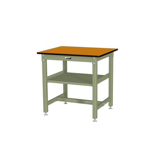 中量作業台/耐荷重800kg 中間全面棚板 固定式 メラミン天板 ワークテーブル800シリーズ 幅900×奥行750×高さ900mm SVMH−975S2−MG 天板木目柄×脚グリーン 1台