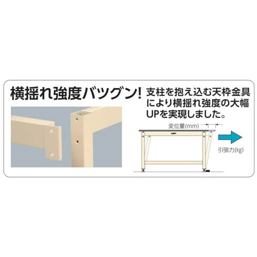 固定式の中量作業台。立ち作業に適した高さです。独自構造により横揺れ強度抜群!弾力性があり積載物を傷つけにくい塩ビシート貼り天板、芯材はパーチクルボードの為たわみにくいです。脚部中間と脚元に全面棚板付き |
