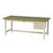 固定式の重量作業台。座り作業に適した高さです。独自構造により横揺れ強度抜群!弾力性があり積載物を傷つけにくい塩ビシート貼り天板を採用。3段キャビネット付き。 |