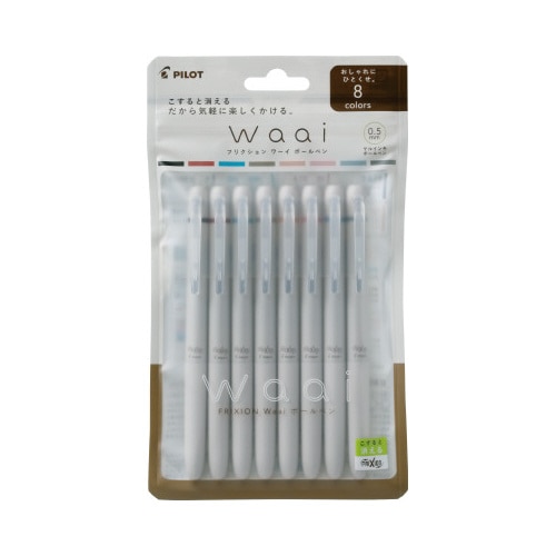 「フリクション Waai」は、シンプルで生活に溶け込むボディーカラーの消せるボールペンです。まるみのある形状で手に馴染む細軸になっています。インキ色は使いやすいけれど、少し珍しい8色をそろえました。 |