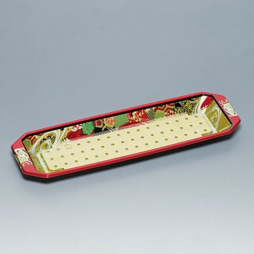 漆器のような高級感ある印刷柄です本体底面に凸型の突起を付けており、にぎり寿司の周りをしっかりホールドし寿司が転ぶのを防ぐ形状ですスミ切りを施した優美でシャープな形状がどのようなメニューにも合います |